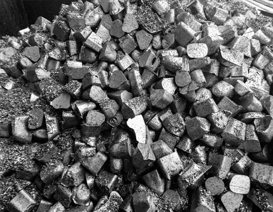 At this stage, the semi-finished product, 95 to 97 percent lead and containing dissolved metallic and non metallic (oxide and sulphide) impurities, is known as base bullion. The bullion is maintained at a temperature just above its melting point, about 330 °C (626 °F). At this temperature, the solubility of copper in lead is very low, so that the copper content segregates and forms a scum, or dross, on the surface of the bath in the drossing kettle. After this is skimmed off, more copper and other impurities are brought to the surface by stirring sulphur and lead pyrite into the bath or by agitating it with submerged air lances. These impurities are also skimmed off, and the remaining base bullion is refined to yield lead of commercial quality. Sulphurous gases generated by the smelting process are tapped from the waste shaft to heat steam and to produce sulphuric acid as a by-product. Refining; The condensed bullion is loaded into Refining kettle, required chemicals are added to remove traces of zinc, iron, copper and antimony. All impurities are skimmed off, resulting in 99.97% lead, which is widely used commercial grade. Hot metal pump is used to fill the mould of a continuous caster which results into 30 kgs ingots.